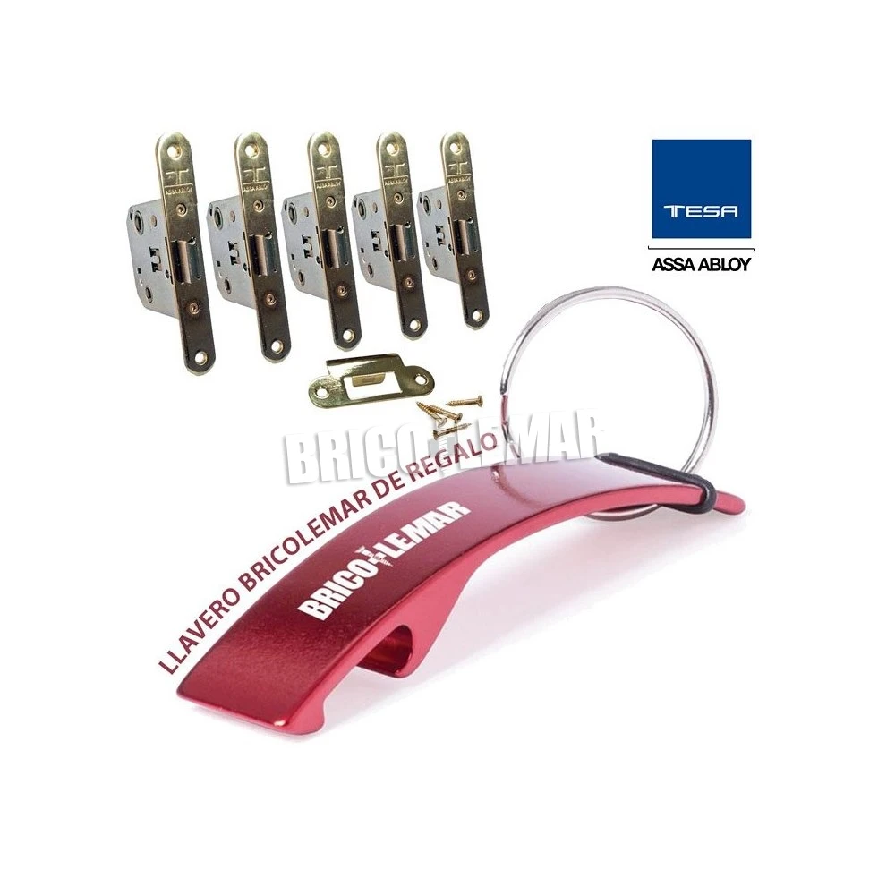 5 cerraduras de picaporte 2004U 5R/50 HL de Tesa, una cerradura reversible que posee una condena cuyo desbloqueo es automático, o sea que al ser activada la condena con la puerta abierta ésta saltará una vez que se cierre la puerta.