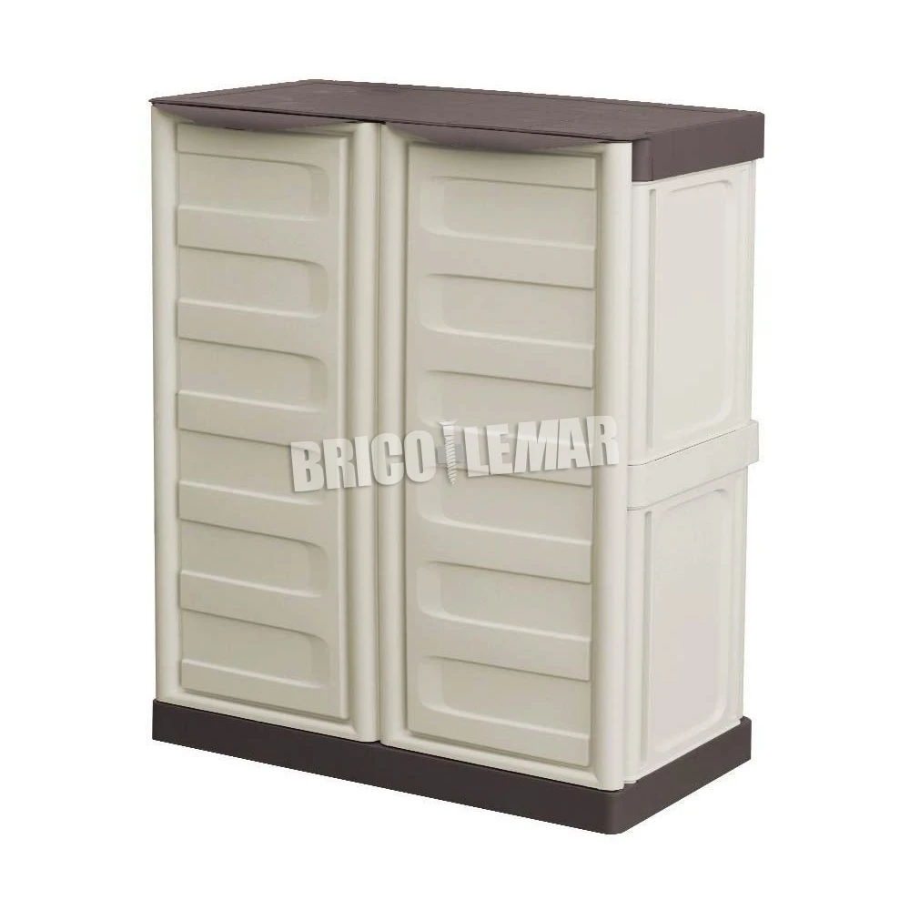 Armario bajo con diseño sobrio y elegante y un sistema de montaje sencillo. Su estructura de estantes integrados hace que este armario sea muy robusto, garantiza una fácil apertura de las puertas. Está fabricado en polipropileno, un material a prueba de golpes, resistente al frío, a la intemperie. Sistema resistente al desgaste con bisagras de acero que garantizan un cierre rápido. Alta estabilidad y capacidad de carga.