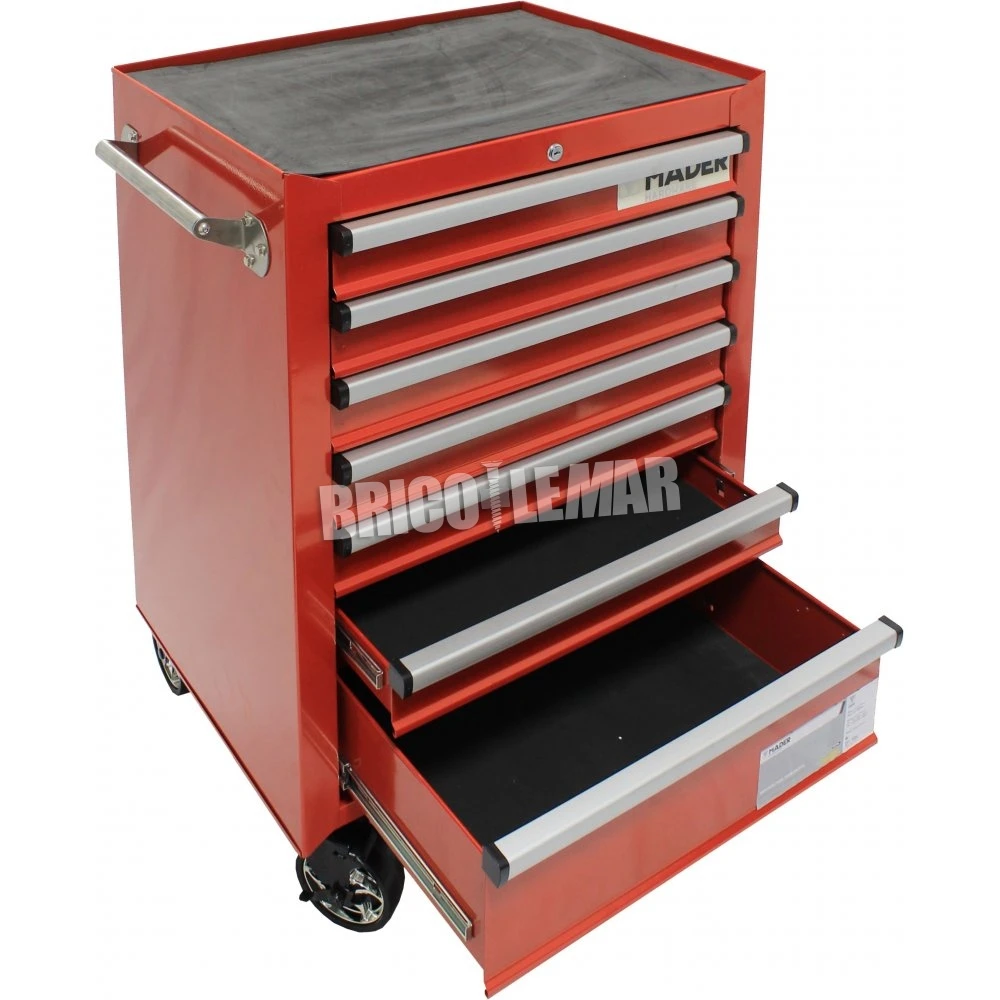 Gabinete para herramientas metálico con 7 cajones y ruedas para transportar.