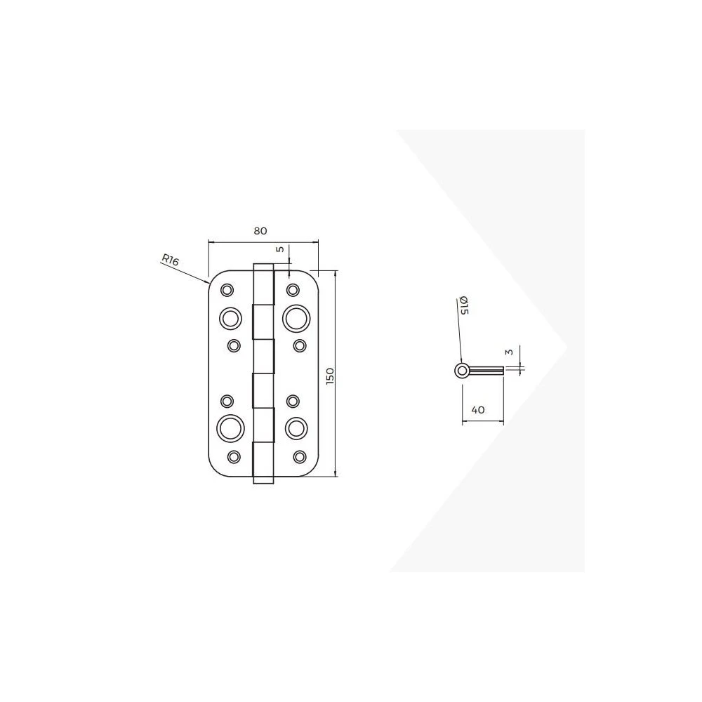 - Bisagra de seguridad con sistema universal de 2 hojas, sin remates y de cantos rodados. Permite la unión entre la puerta y el marco, con 4 orificios avellanados en cada una de ellas.