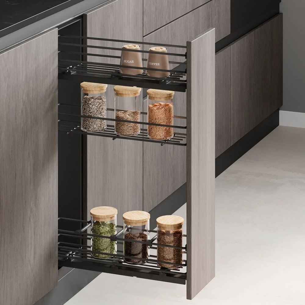 Diseñado para módulos de 800 mm de altura, el botellero extraíble TitaneMax es la solución perfecta para optimizar el almacenamiento en los módulos inferiores de la cocina, especialmente en espacios reducidos. Diseñado para organizar botellas de manera eficiente, este modelo permite aprovechar al máximo los espacios auxiliares de los muebles de cocina. Gracias a su diseño extraíble, ofrece un acceso fácil y cómodo al contenido de sus cestas, siendo una opción ideal para mantener el orden en la cocina.