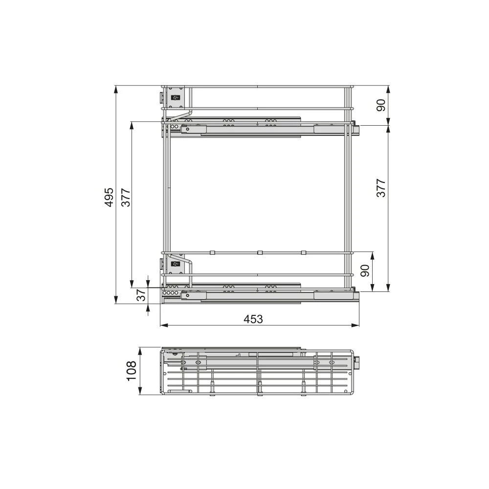 Botellero extraible para módulos inferiores de cocina fabricado en acero cromado ideal para espacios reducidos o muebles auxiliares. Fácil instalación: fijación en el lateral izquierdo del mueble y regulación total de la puerta (5D). La estructura está fabricada en acero cromado con 2 niveles e incorpora guías de rodillos con extracción total y cierre suave que permiten un suave deslizamiento del sistema y evitan los portazos. El cesto inferior dispone de 4 huecos para la organización de las botellas. Capacidad de carga de hasta 25kg.
