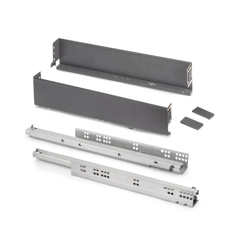 El kit incluye dos costados laterales, un juego de tapas frontales, un juego de guías y los tornillos para fijar el panel frontal. Está fabricado en acero con un acabado pintado gris antracita o blanco.