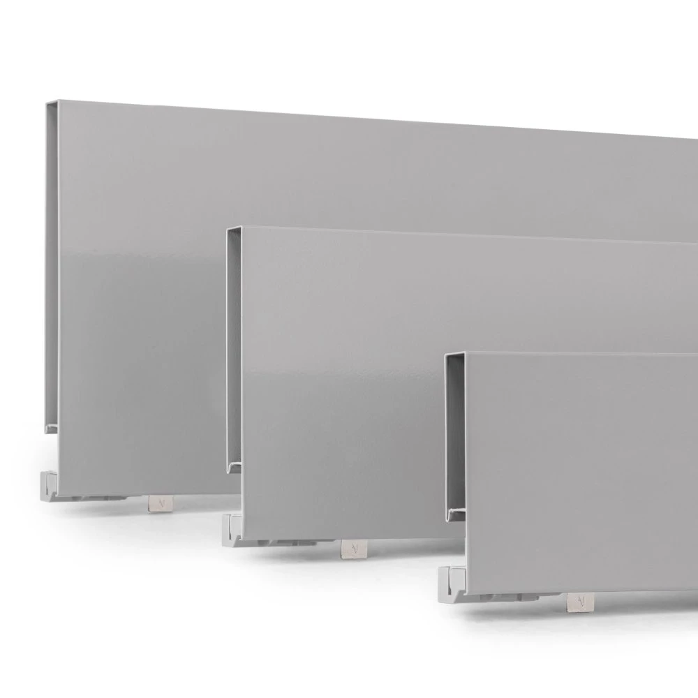 Kit para cajón para cocina y baño Vertex con todos los elementos necesarios para su montaje. Es la solución óptima para los muebles de tu cocina, baño o armario con un elegante diseño en color gris antracita y blanco. Cada kit se compone de todos los elementos necesarios para el montaje de un cajón de altura 178mm, dimensionado para un espesor de tablero de 16 mm para el fondo y la trasera del cajón. Incluye: dos costillas laterales, un juego de guías con cierre suave, un juego de tapas embellecedoras y las fijaciones para el frente del cajón.