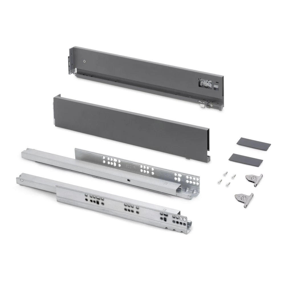 - Kit de herrajes necesarios para el montaje de un cajón de altura 93 mm y profundidad 450 mm, a excepción de la frontera, trasera y fondo.