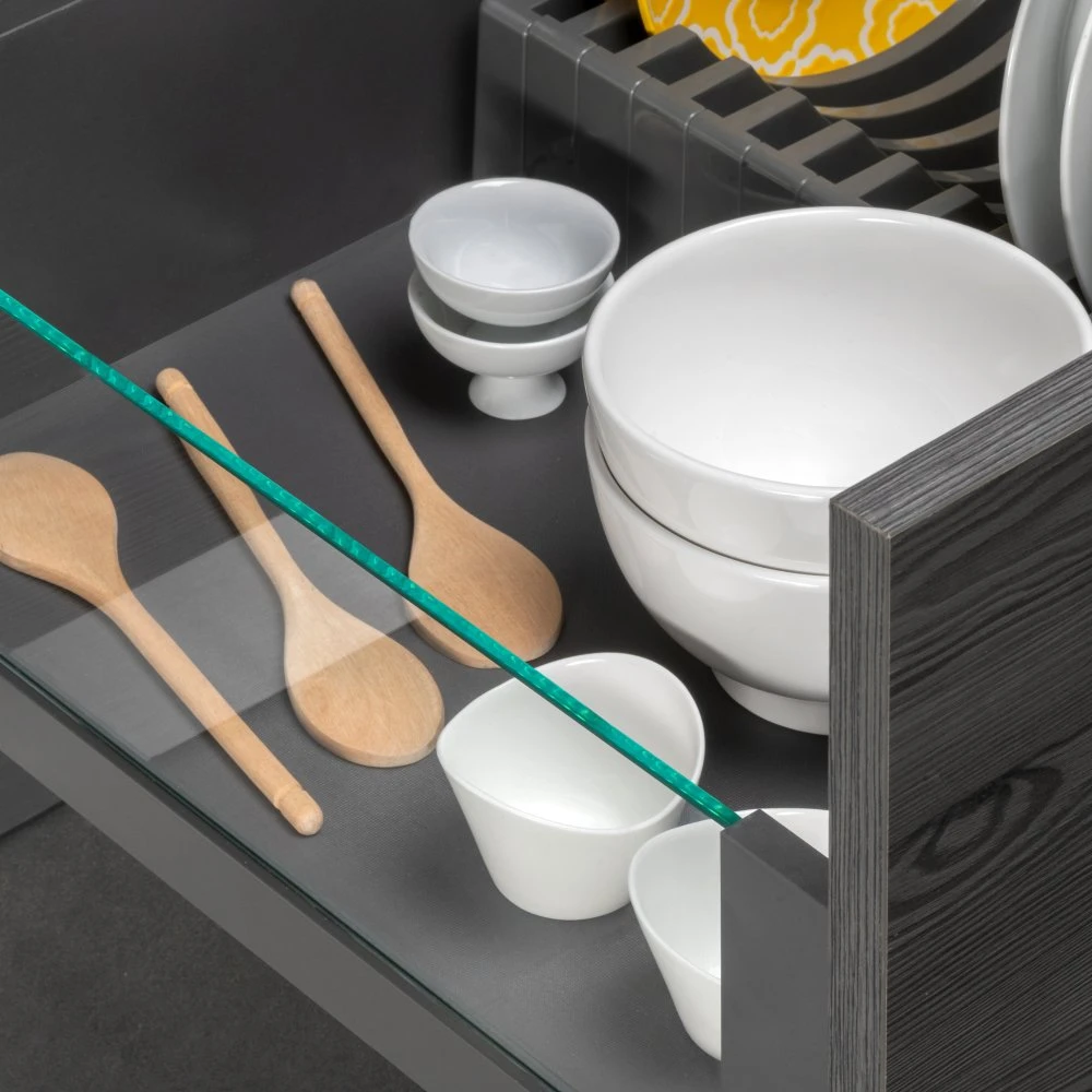 Cajón Vertex con laterales de vidrio transparente para los muebles de tu cocina. Poseen un elegante diseño de líneas rectas en color gris antracita y está disponible en diferentes alturas y profundidades de cajón.
