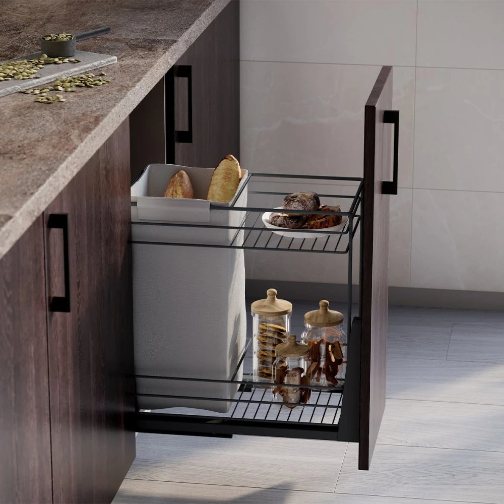 - Carro extraíble Titane con diseño funcional y práctico, equipado con dos cestas de alambre y una bolsa para pan. Una solución profesional para maximizar el almacenamiento en módulos bajos de cocina y garantizar la organización eficiente de los alimentos.
