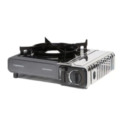 Última versión del famoso Camp Bistro (color negro/gris) con mejoras en los sistemas de seguridad, mejor soporte de cacerolas, acabados fáciles de limpiar y cómodo de usar. Esta robusta cocina viene con su propio estuche de plástico duro para transporte.