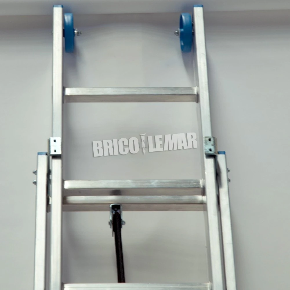En los extremos del segundo tramo, dispone de ruedas (R) para facilitar el deslizamiento de la escalera sobre la pared. Está también equipada con un dispositivo de enganche superior automático en acero zincado. Si el operario suelta accidentalmente la cuerda, la escalera se bloquea.