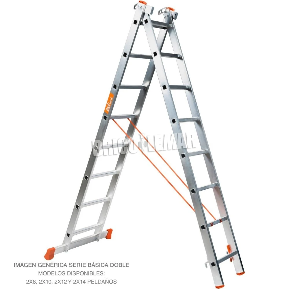 Es una escalera fabricada en aluminio, de 2 tramos y de muy fácil maniobrabilidad por su ligereza y por su articulación de alta seguridad, ya que dispone de anti apertura en su parte superior y trinchas inferiores. Posee tacos de PVC antideslizantes y tapones de PVC en los extremos.