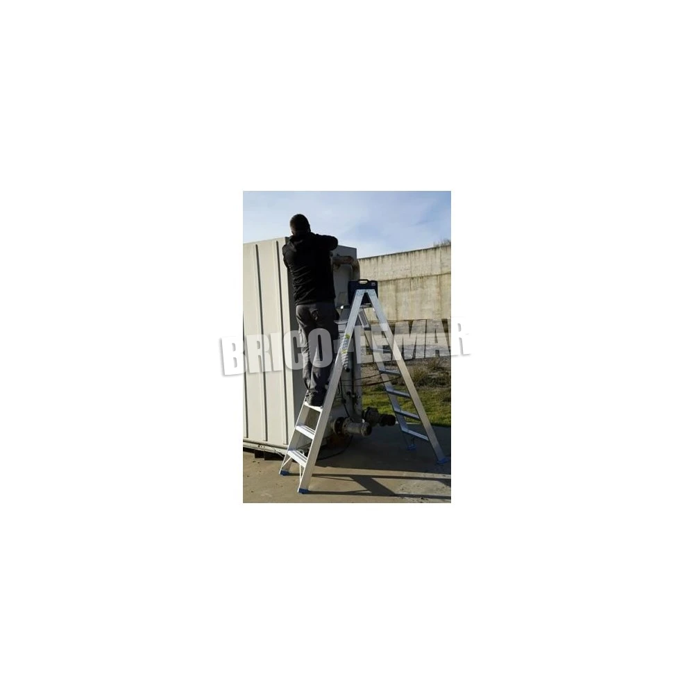 Sus refuerzos interiores aumentan la rigidez de la base. Sus tirantes anti-apertura de nylon impiden la apertura de la escalera. Tiene tacos escalera ensanchados con superficie antideslizantes, preparados para todo tipo de terrenos, la convierte en una escalera profesional segura y ligera.