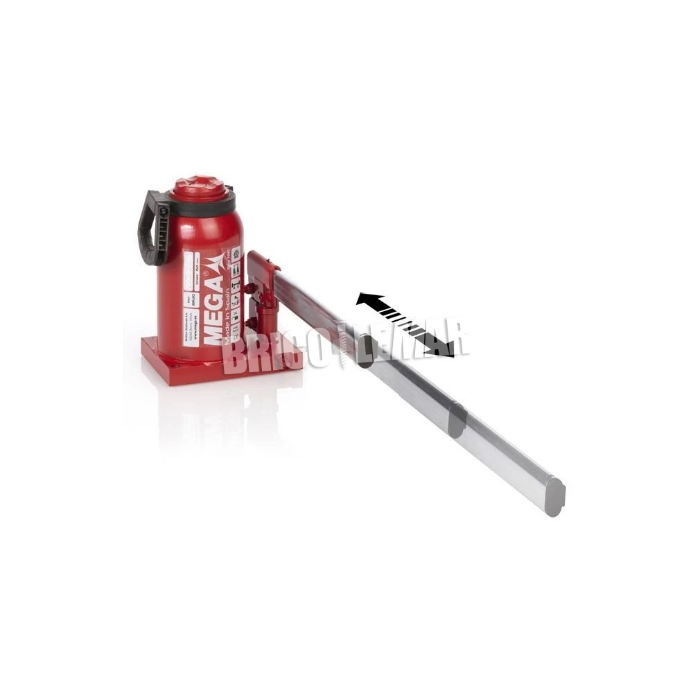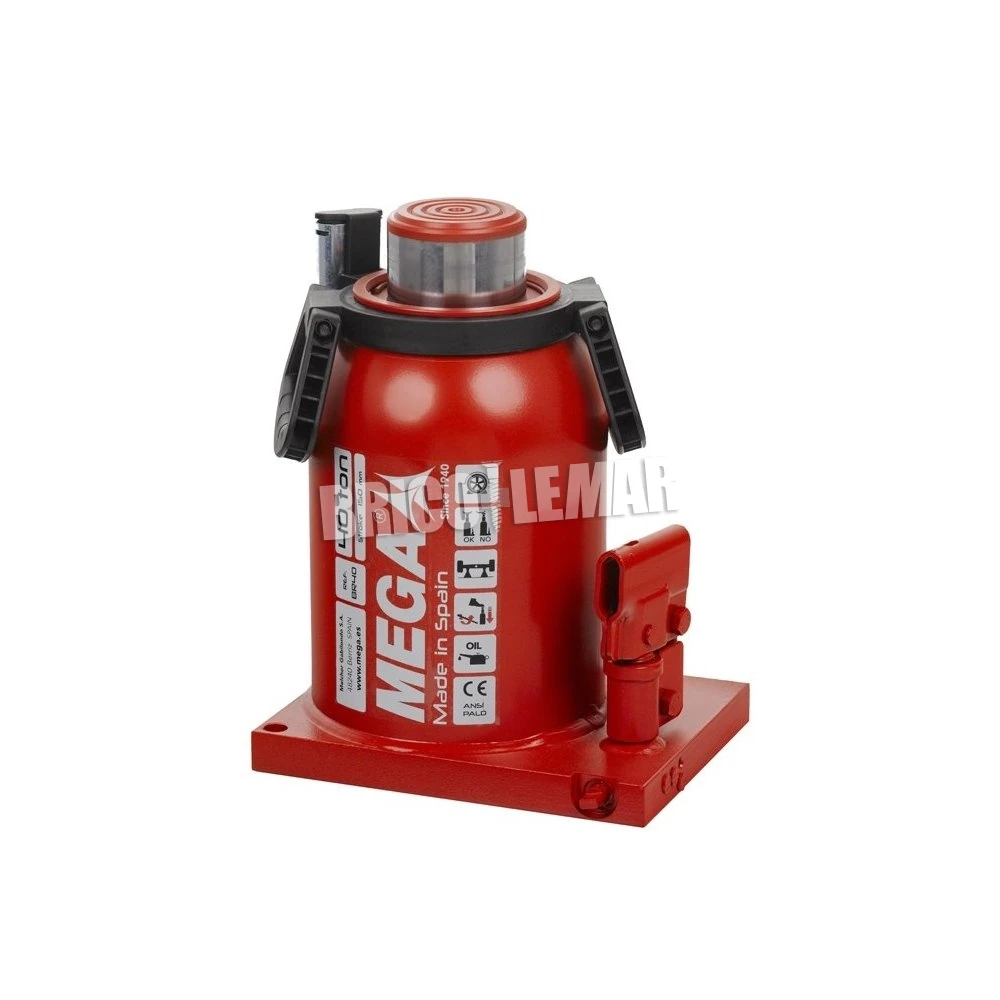 Gato hidráulico Mega de botella con una fuerza nominal de 40 toneladas, de aplicación universal para la elevación o desplazamiento de carga. Sólido, compacto y garantizado, con la tecnología más desarrollada del mercado, de mantenimiento fácil y rápido. Incluye asa de transporte giratoria donde se aloja la palanca del gato recogida.