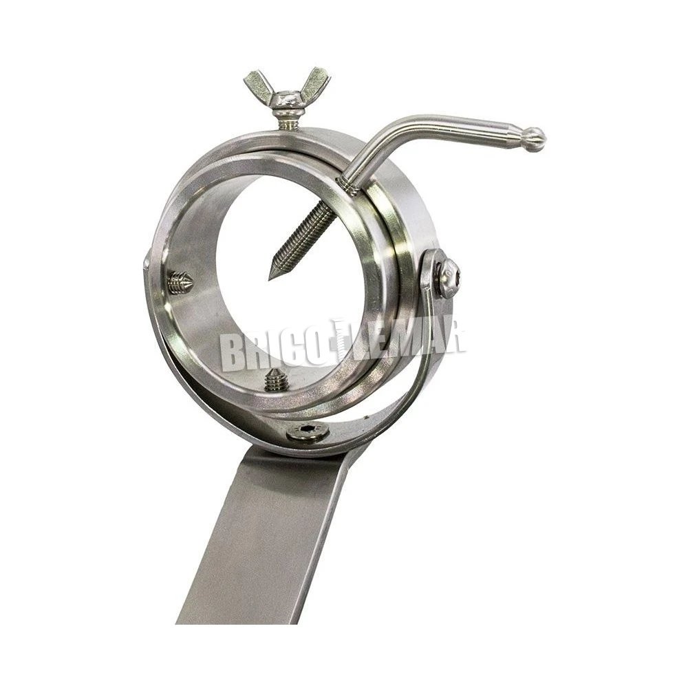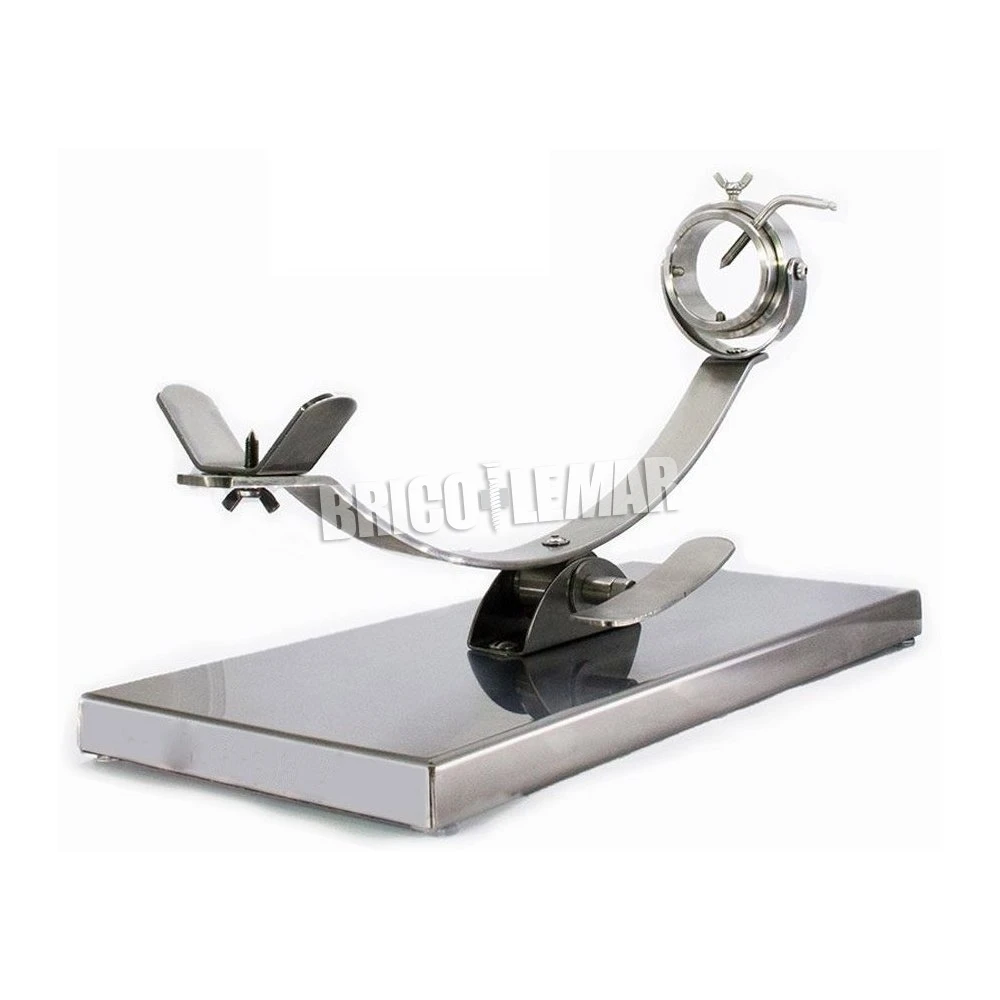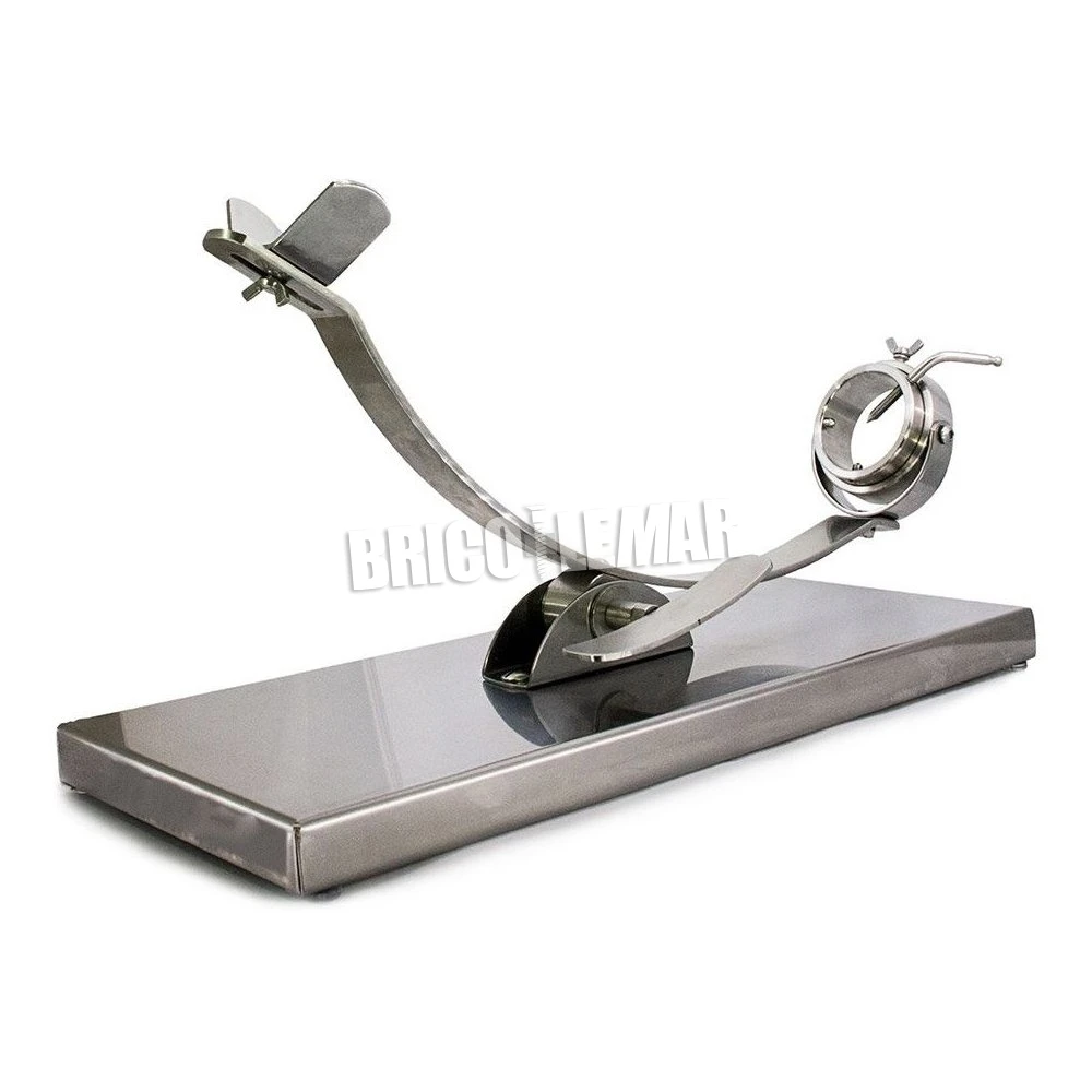 Práctico soporte para jamón profesional con brazo tipo balancín oscilante y giratorio, con este sistema se puede operar con el jamón desde la postura más cómoda según la zona donde se vaya a realizar el corte. La base del jamonero está fabricada en acero inoxidable.