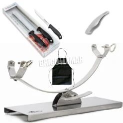 Jamonero Inoxidable de Balancin Kabra + Chaira + Cuchillos Jamonero y Deshuesador + Pinza para Jamon + Delantal Bricolemar