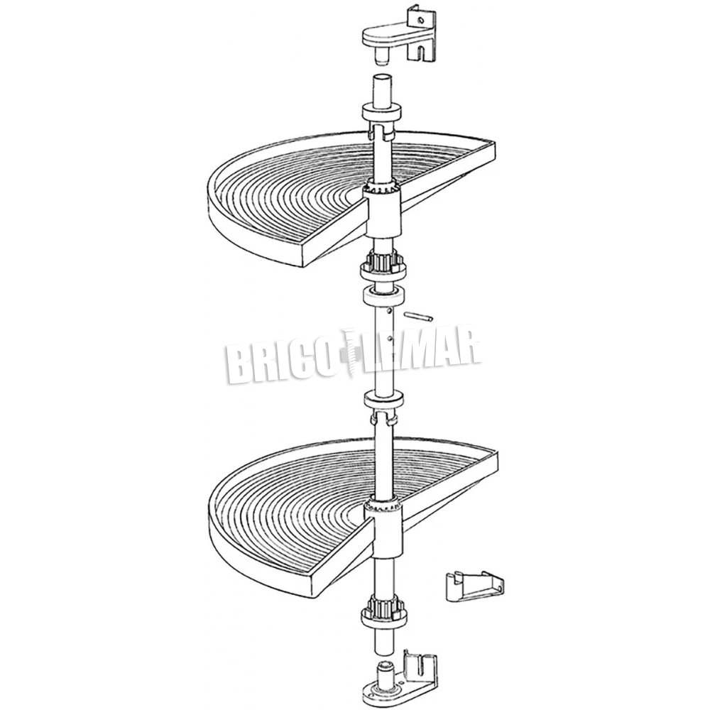 Conjunto de bandejas giratorias en forma de media luna diseñadas para muebles rinconeros. El sistema compuesto por 2 bandejas y una barra de aluminio para instalar en módulos de 800mm. Es de fácil montaje con posibilidad de extraer la bandeja inferior al abrir la puerta.