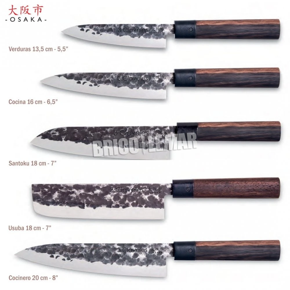 El juego de cuchillos de la serie Osaka, de 3 Claveles, ofrece una perfecta combinación de la belleza natural de la madera con la hoja forjada martilleada de diseño oriental. El mango es de madera de granadillo, con un acabado encerado.