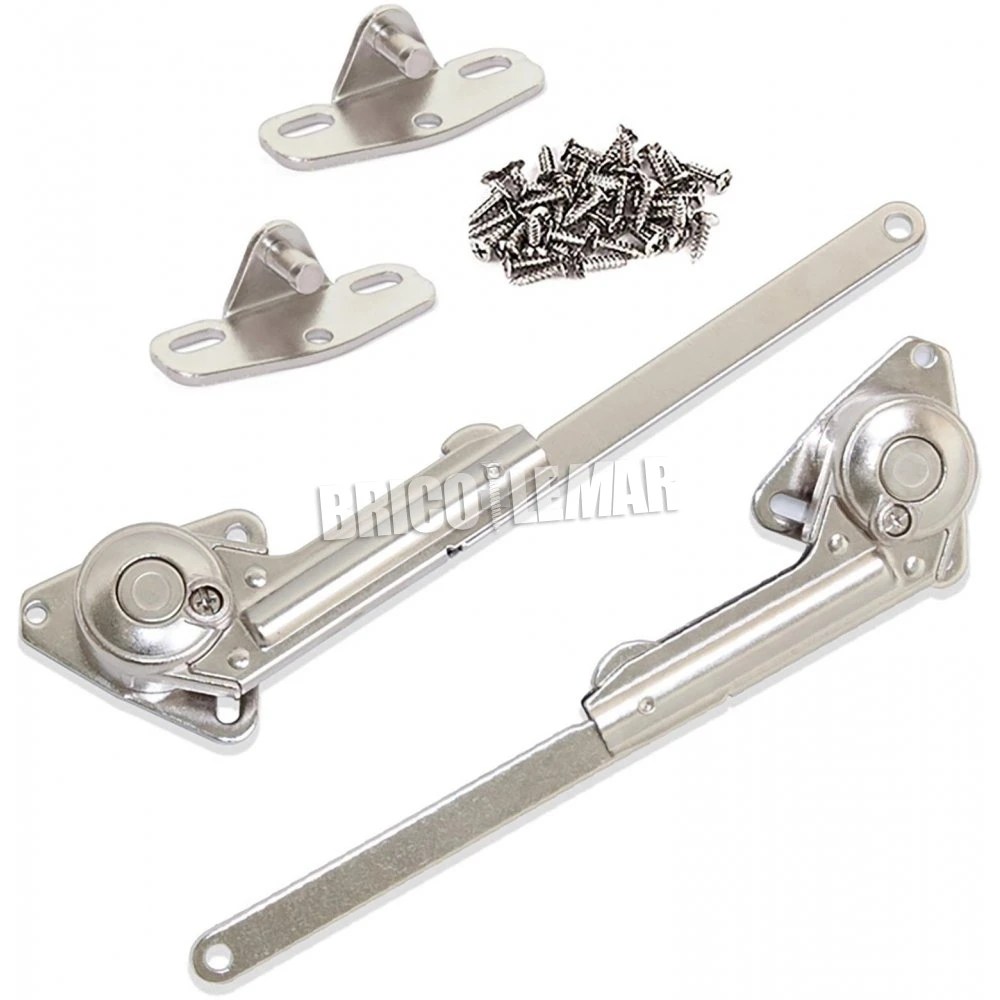 Juego de compases para muebles que permiten la apertura de las puertas abatibles, con una duración testada superior a 50.000 ciclos de apertura/cierre. Diseñado para absorber la apertura brusca de las puertas en muebles de cocina, hogar y baño. Asimismo se puede regular la velocidad de la puerta mediante un tornillo. Dispone del enganche para puerta de madera y de los tornillos necesarios para su montaje. Están realizados en acero y zamak con acabado niquelado.