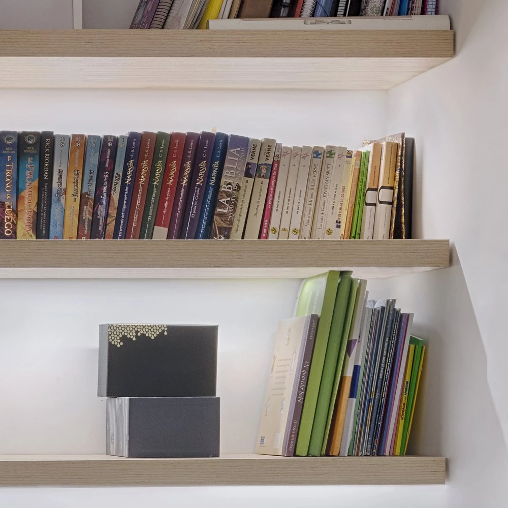 - Soportes para la sujeción de estantes que se fijan en la pared y quedan ocultos en el mueble con un mecanizado especial, para ello es necesario colocar dos soportes por estante.