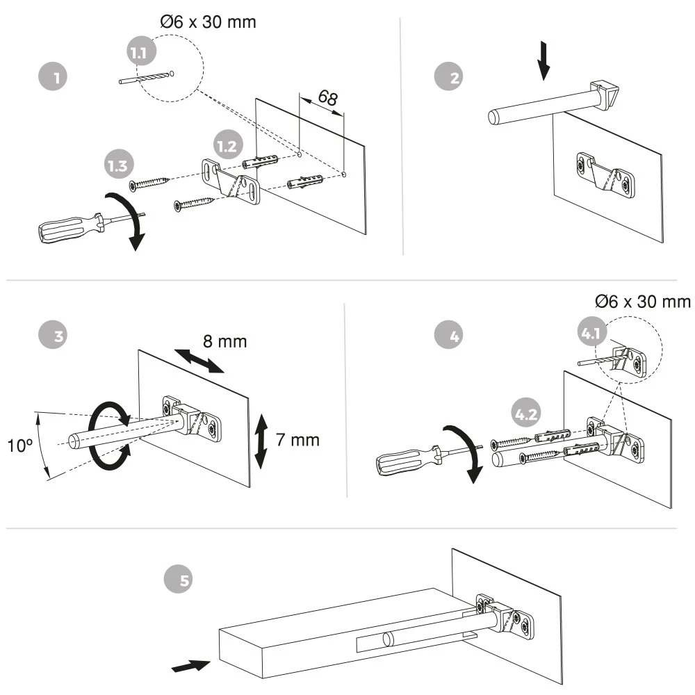 Soportes ocultos que permite un montaje invisible en la pared de la estancia, quedando un diseño de líneas sencillas y limpias. Muy utilizado para la sujeción de estantes en el muebles de hogar y baño. Los soportes se fijan a la pared y quedan embutidos en el mueble con un mecanizado especial. El montaje resulta muy fácil y rápido gracias a su triple regulación, horizontal, vertical y de inclinación, totalmente independientes entre sí. Se suministra con tornillos y tacos metálicos para fijación a pared, ideales para paredes de ladrillo hueco pero no son aptos para paredes de cartón-yeso.
