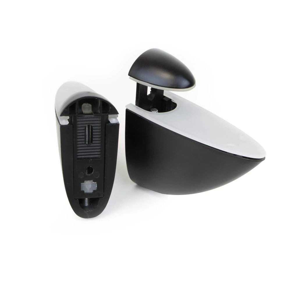 - Fabricados en plástico y zamak con acabado pintado negro.