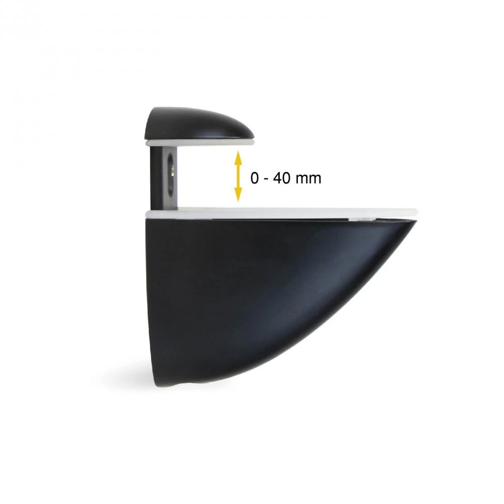 - Los soportes cuentan con una tapa inferior móvil que ajusta el estante sobre la tapa superior, eliminando la necesidad de agujeros o mecanizados especiales en el estante. Es necesaria la instalación de dos soportes por estante, y son compatibles con grosores que van desde 0 hasta 40 mm.