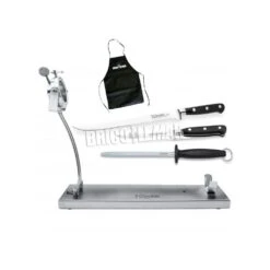 El kit incluye el soporte de jamonero Pro con cabezal giratorio que facilita el corte de todas las partes del jamón, dos cuchillos de la serie Forgé, un cuchillo jamonero de 25cm y un cuhillo deshuesador de 13cm.
