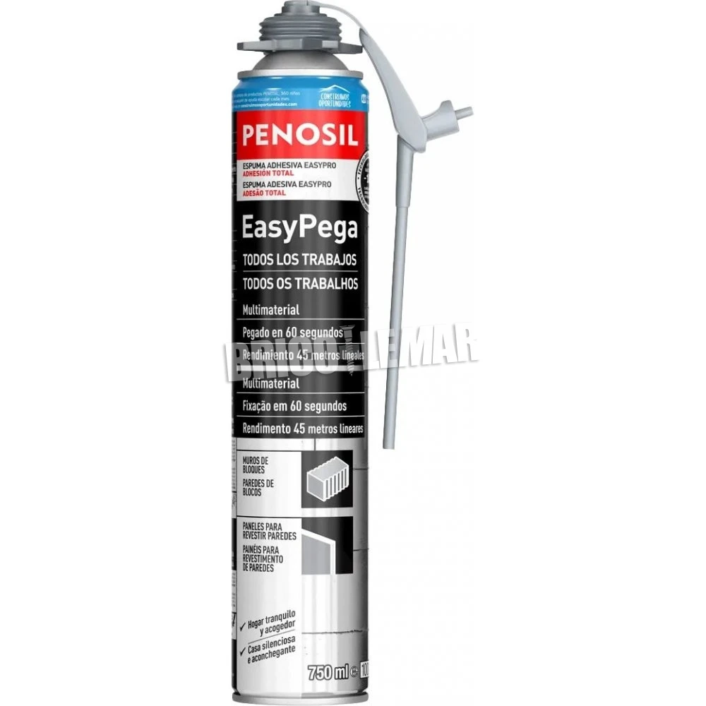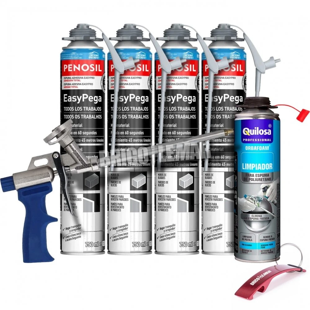 Y por último, 4 cartuchos de 750ml del adhesivo universal de espuma de poliuretano para trabajos de construcción en interiores y exteriores. La espuma adhesiva EasyPega Todos los trabajos tiene excelentes propiedades adherentes en la mayoría de los materiales utilizados comúnmente en la construcción. Posee una excelente adhesión sin imprimación previa en la mayoría de los materiales, como hormigón, ladrillos, piedra, yeso, madera, metales, poliestireno, PVC y otros plásticos, así como a sustratos minerales.