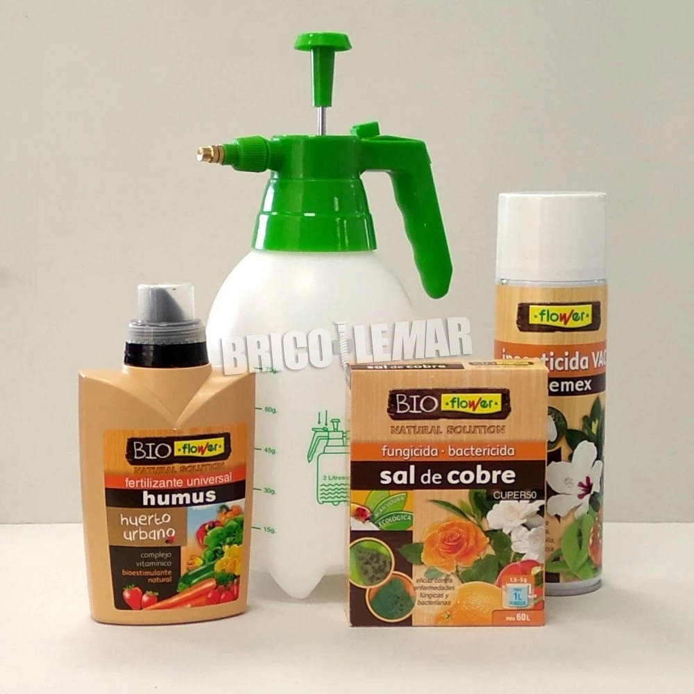 Kit pulverizador a presión 2L + Insecticida Natural spray 500ml + Fungicida Biológico 6x15g + Fertilizante líquido 500ml