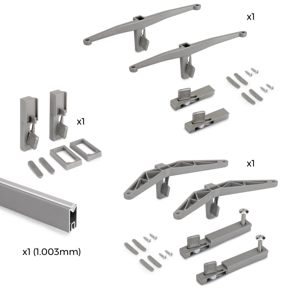 Kit de soportes para la estructura modular Zero. Se compone de 1 juego de soportes para estante de madera, 1 juego de soportes para módulo, 1 juego de soportes de barra y una barra de colgar de 1 m. Incluye todos los accesorios para realizar su montaje en el perfil.