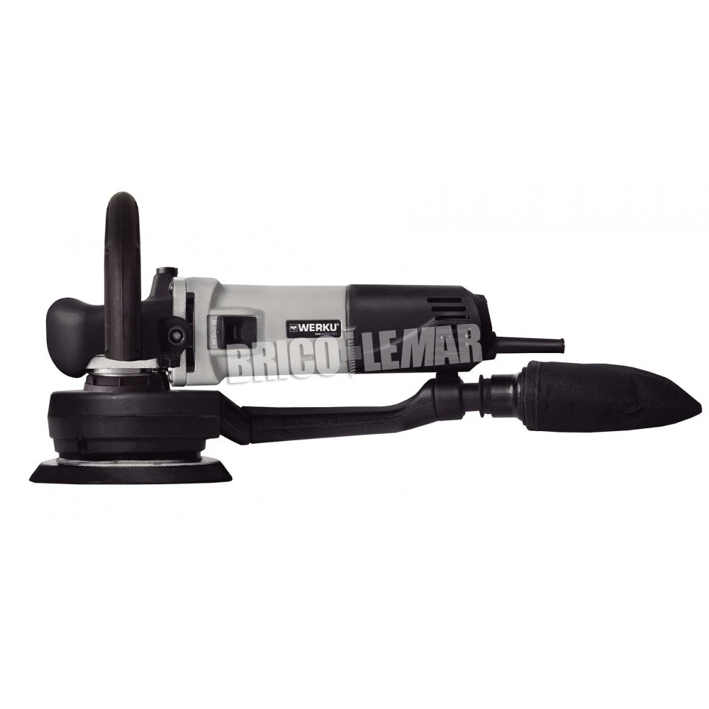 Lijadora circular para paredes con sistema de extracción de polvo y mango auxiliar orientable. Fijación de los discos abrasivos por velcro. Incluye colector de polvo.