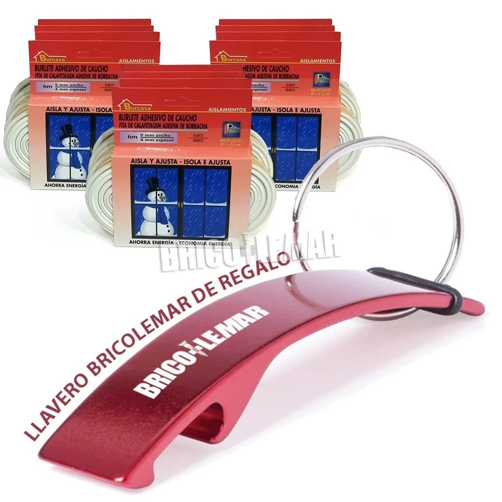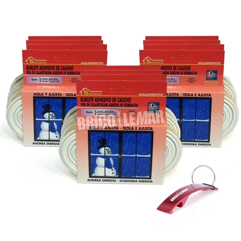 12 burletes de 6 metros cada uno de tipo P en color blanco, con un ancho de 9mm y un espesor de 4mm.