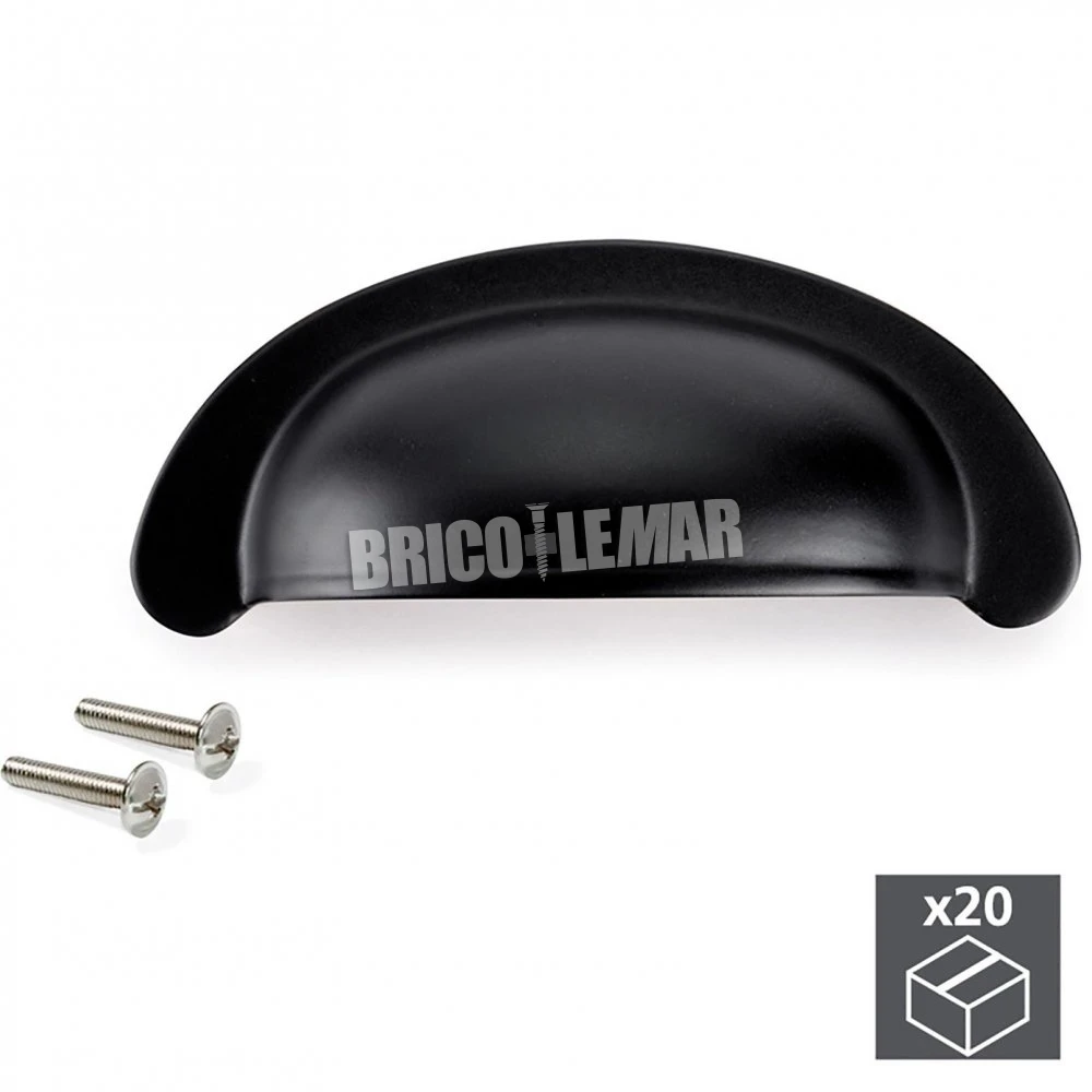 Lote de 20 tiradores, embalados individualmente para evitar arañazos y golpes, fabricados en zamak con acabado negro. Válidos para interejes (distancia entre agujeros de montaje) 64mm. Tornillos M4 para la instalación incluido.