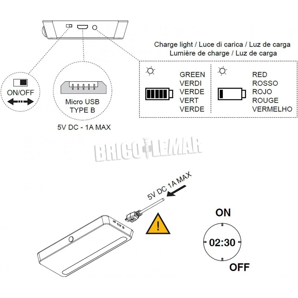 - Sistema de iluminación sin cables: batería recargable de polímeros de litio de 850mAh, recargable con un cargador de teléfono móvil de 5V DC 1A con conector micro USB tipo B.