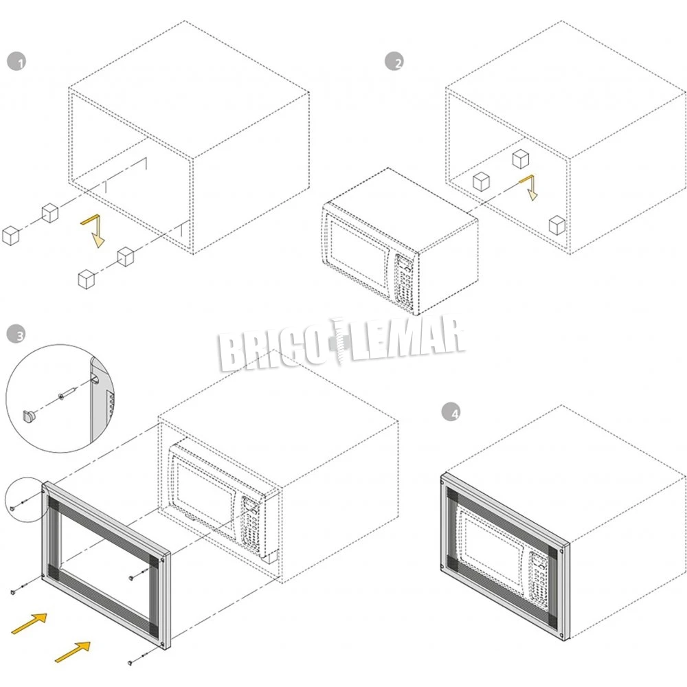 Marco microondas para su instalación en un módulo de cocina de 600mm de ancho. Fabricado en plástico con recubrimiento electrolítico níquel satinado (efecto Inox). Rejilla debilitada para recortar y ajustar al microondas.