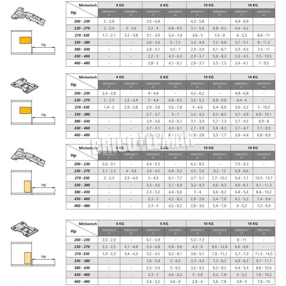 - Mecanismo con fuerza de 14 kg que puede utilizarse con puertas desde 200 mm a 480 mm de alto (consultar tablas de selección).