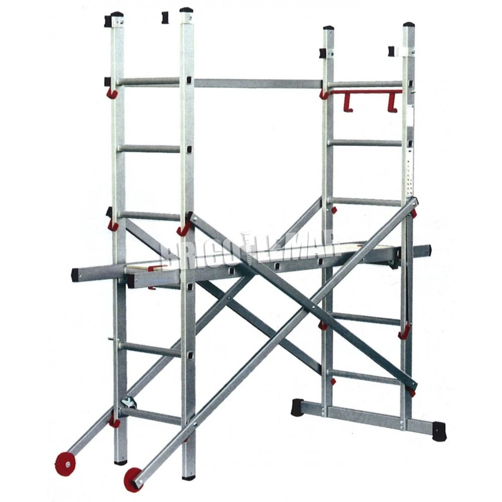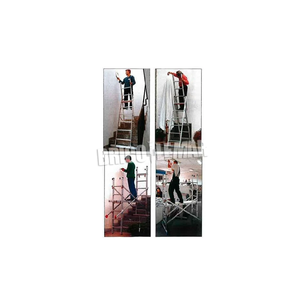 Dispone de dos ruedas de PVC engomado, que sólo se apoyan cuando se traslada la estructura. Es de rápido montaje y fácilmente transportable. Cuando no se usa como andamio, se convierte en una práctica escalera de tijera en apoyo o de múltiples posiciones, dándole una doble utilidad.