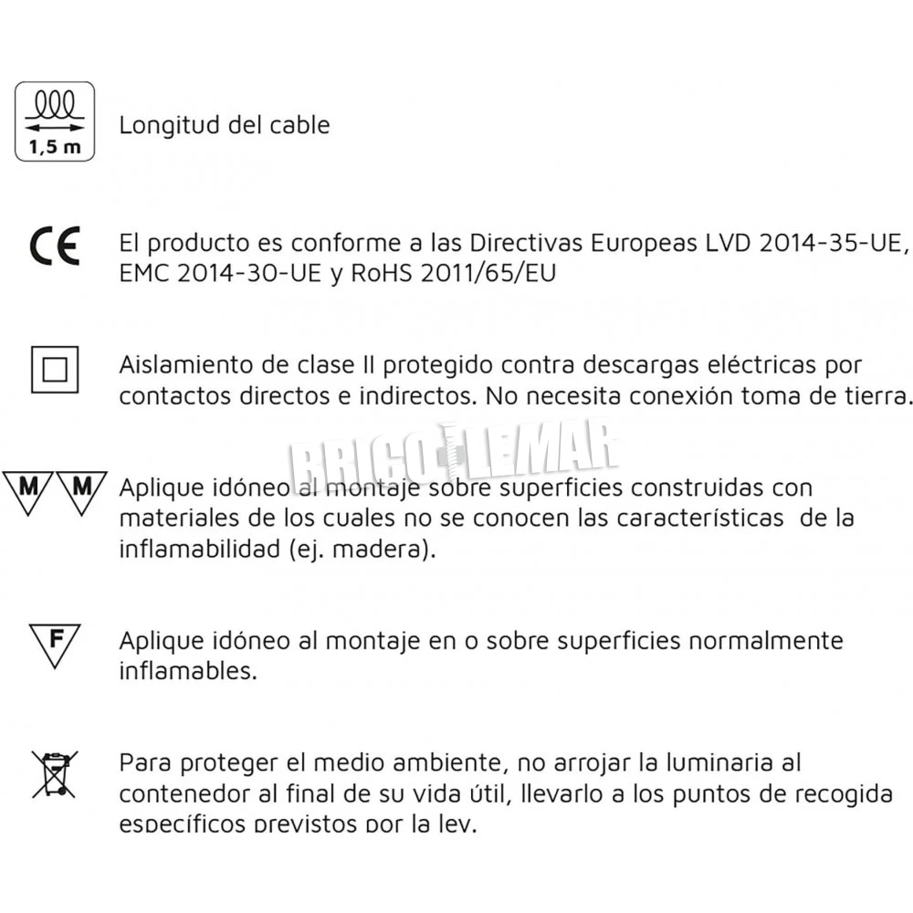 - Cable de 1,5 m con enchufe para su funcionamiento a 250V AC 50Hz.