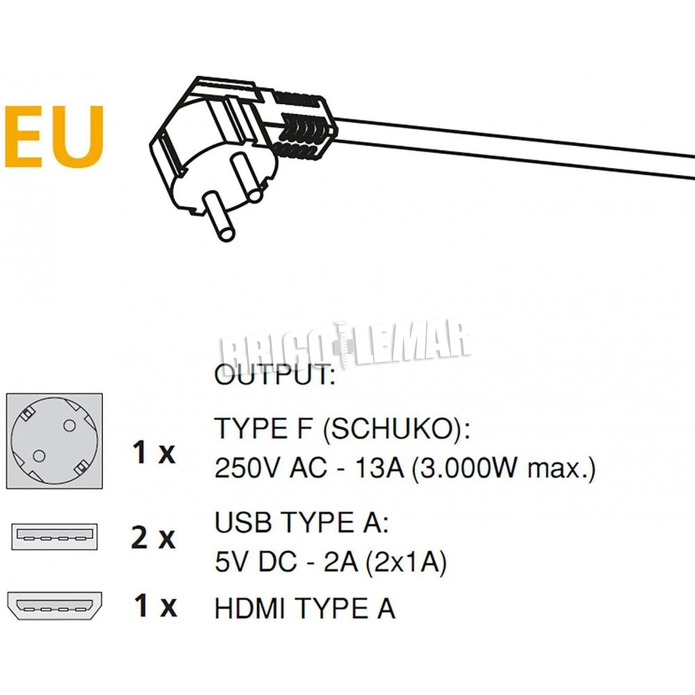 - Dispone de 1 enchufe tipo F Schuko (EU) con una potencia máxima admisible de hasta 3.000W – 13A, 2 conectores USB 5V DC (1 x 2A / 2 x 1,5A) y 1 conector HDMI 2.0.