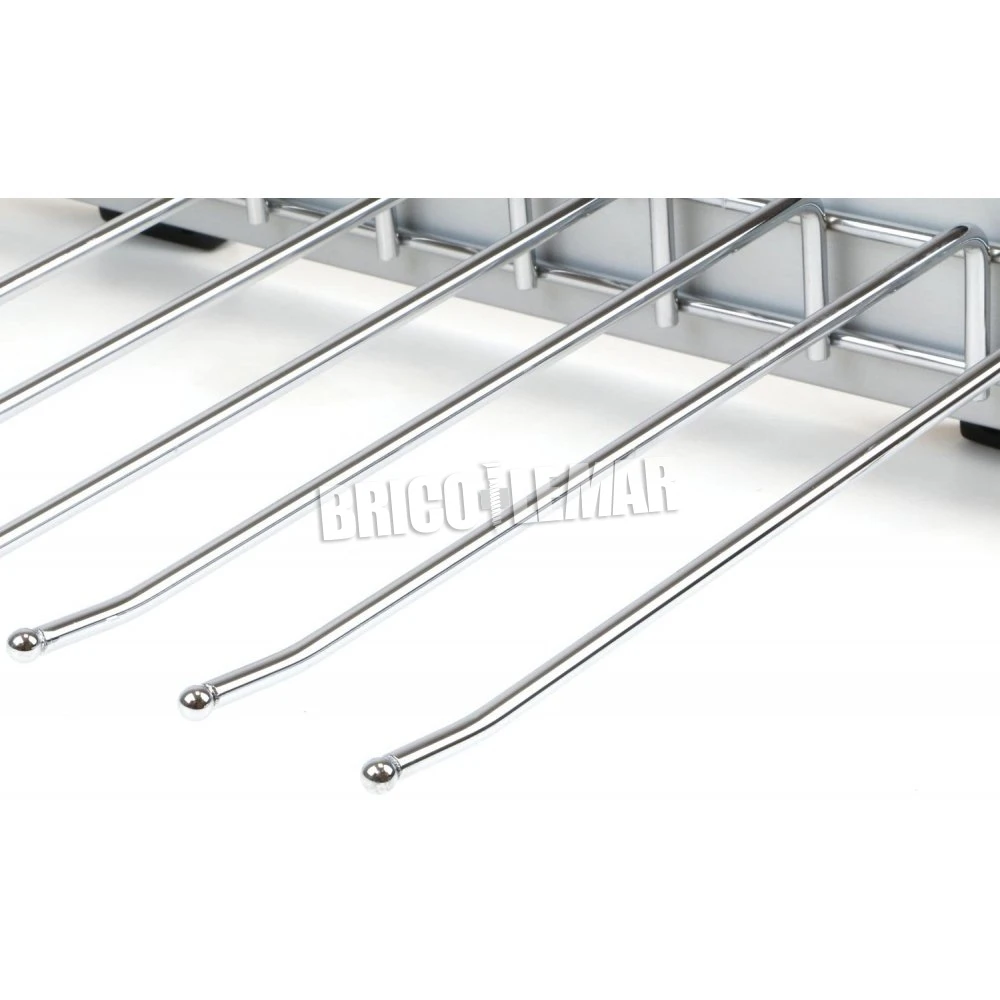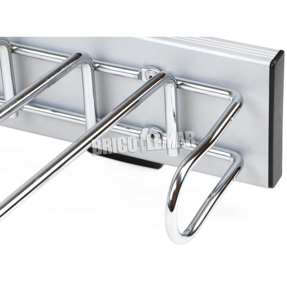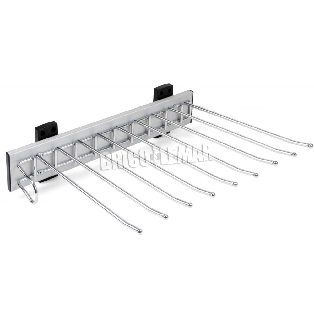 Montaje sencillo en el lateral cuya extracción es mediante guías de bolas para su deslizamiento. Dispone de 9 varillas que incluyen gomas antideslizantes para facilitar que las prendas no resbalen. Además dispone de un tirador frontal para facilitar su extración. Está fabricado en aluminio con varilla de acero cromado y los soportes en plástico negro.
