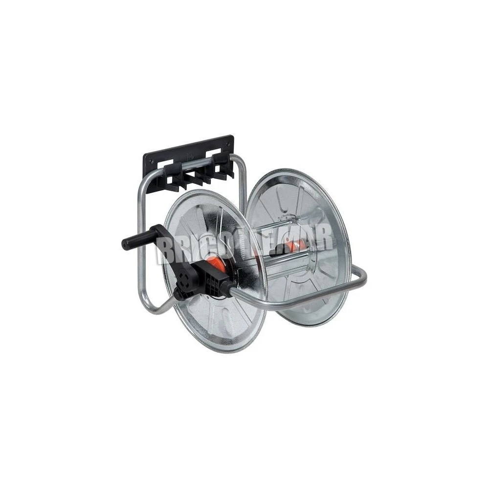 Portamanguera portátil mural de plancha y tubo de acero zincado con capacidad para 50m de manguera (no incluida). Equipado con un robusto colgador para su cómoda fijación a la pared. Ideal para pequeños jardines.