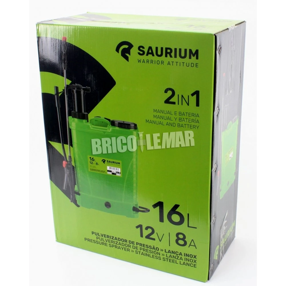 Pulverizador de presión 16L manual y batería 12V 8A Saurium + llavero abridor de regalo