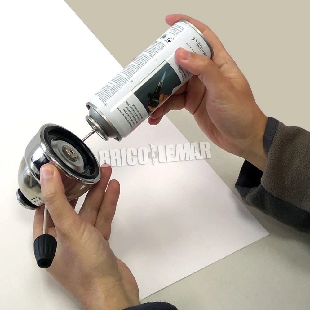 Utiliza gas butano azul universal (gas de mechero) no incluido en el producto, pero disponible en Bricolemar.