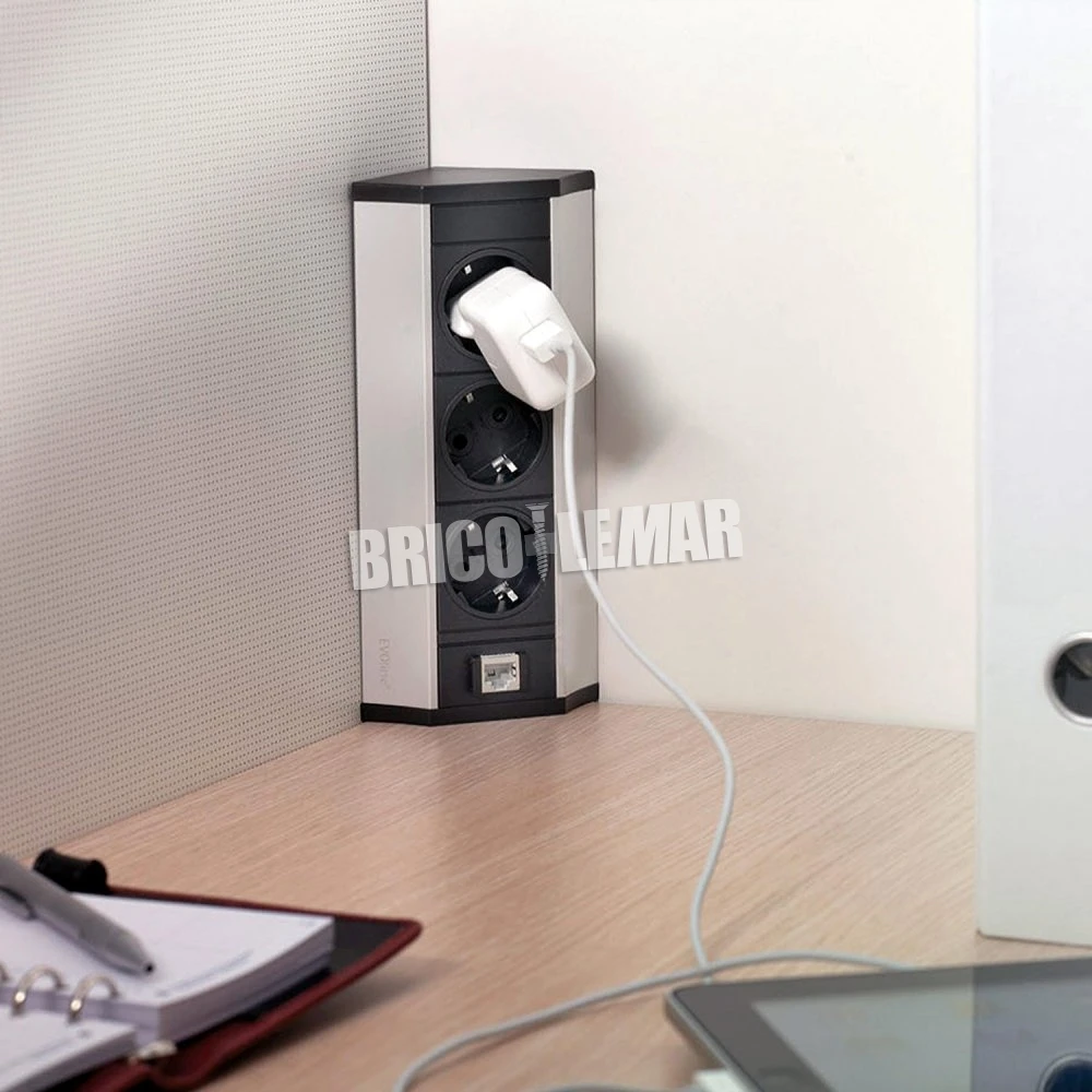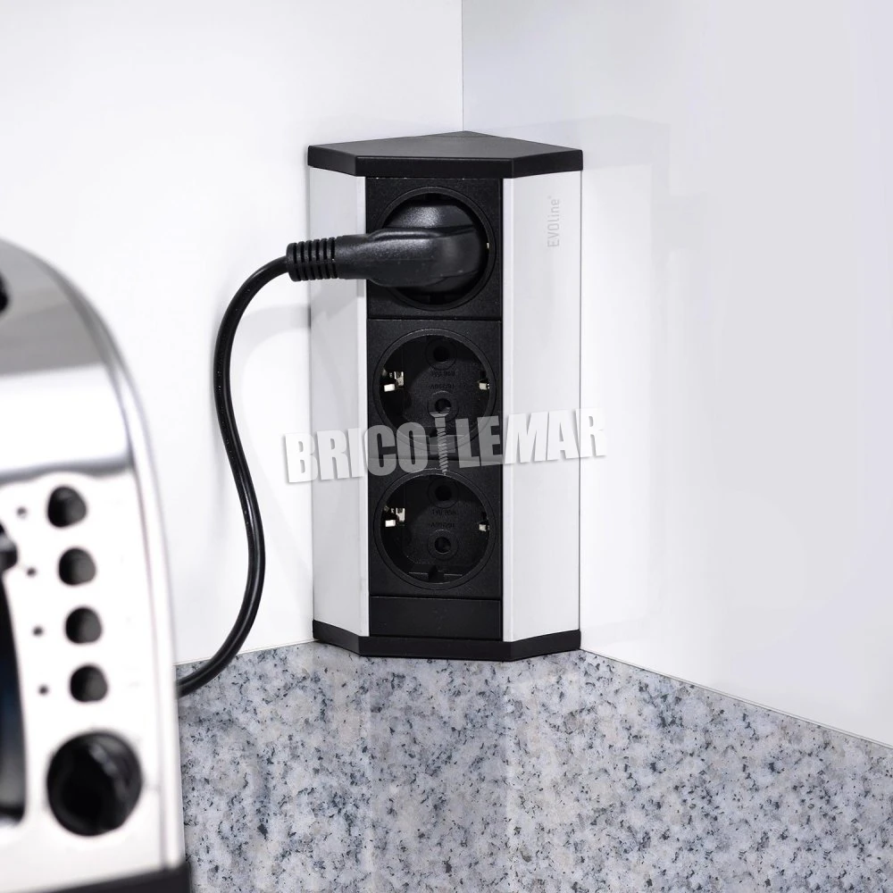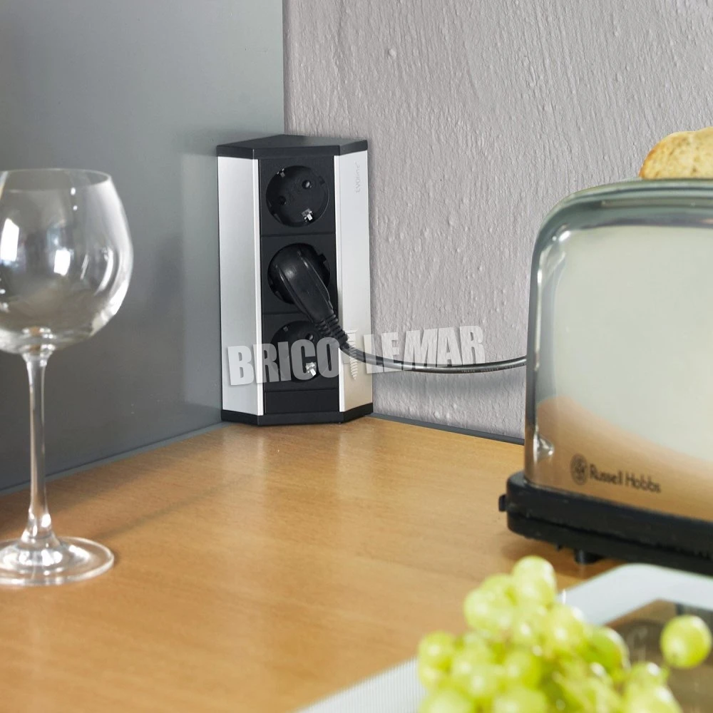 Regleta multienchufe pensada para tener siempre accesible las tomas de corriente en un mueble de cocina, oficina y hogar. Gracias a su diseño de 45º, puede montarse atornillado en horizontal o vertical, quedando totalmente integrado en el mueble.