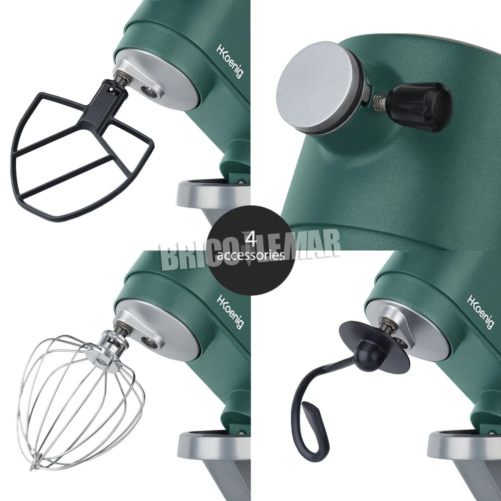 Accesorios incluidos: gancho especial masas pesadas, gancho agitador especial pastas y batidor de varillas, picadora de carne, utensilio para salchichas, utensilio para pasta (rodillo para pasta + cortador de fettuccine + cortador de espagueti), utensilio para ensaladas.
