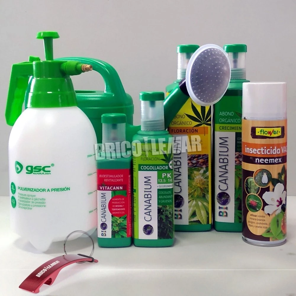 Set 4 productos Canabium para cultivo de cannabis + insecticida natural spray 500ml + pulverizador a presión 2L + regadera 5L