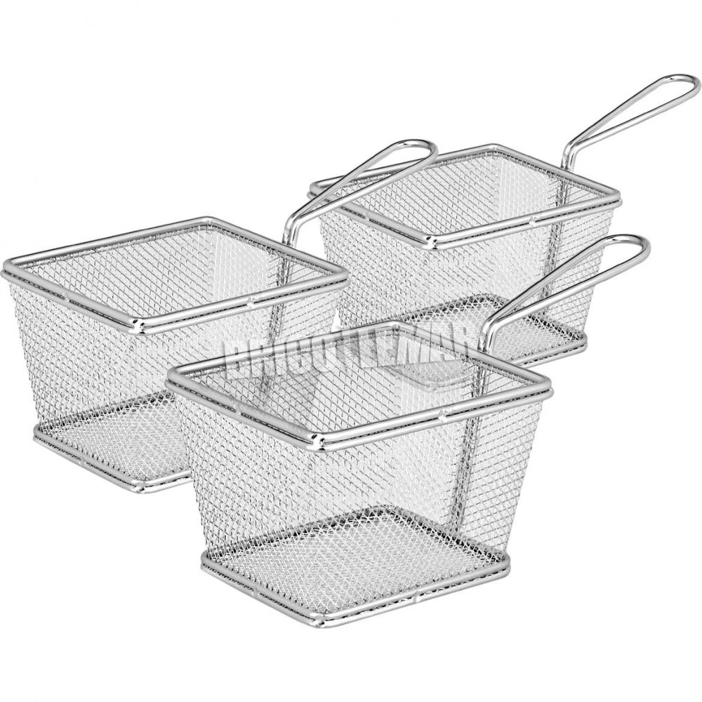Los tres cestillos están fabricados en acero inoxidable con unas medidas de 10 x 12 x 8 cm cada uno. Con ellos podrás presentar de forma elegante en la mesa patas fritas u otros fritos como boquerones, calamares e incluso verduras.