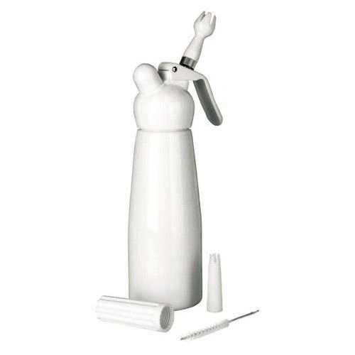 Sifón de aluminio acabado en blanco con recubrimiento interior sanitariamente garantizado para decorar con nata postres, tartas, etc.