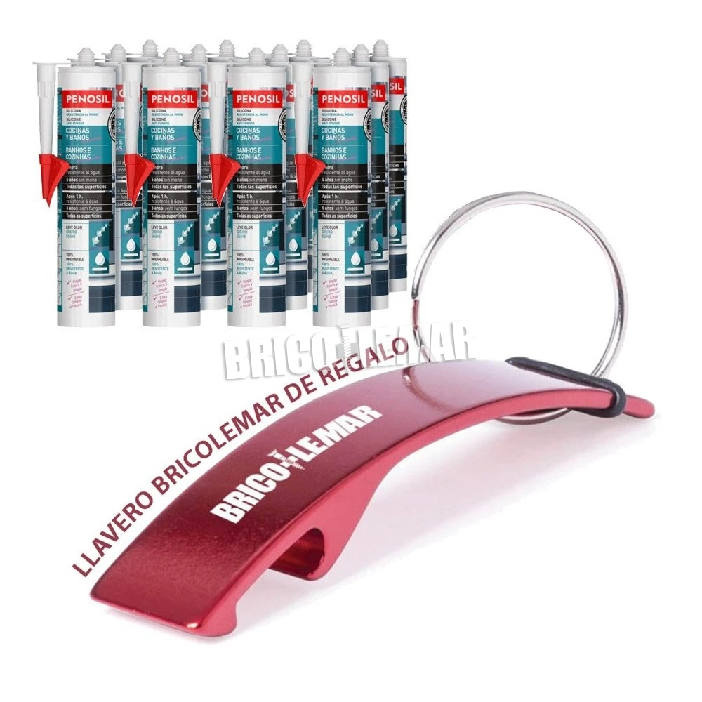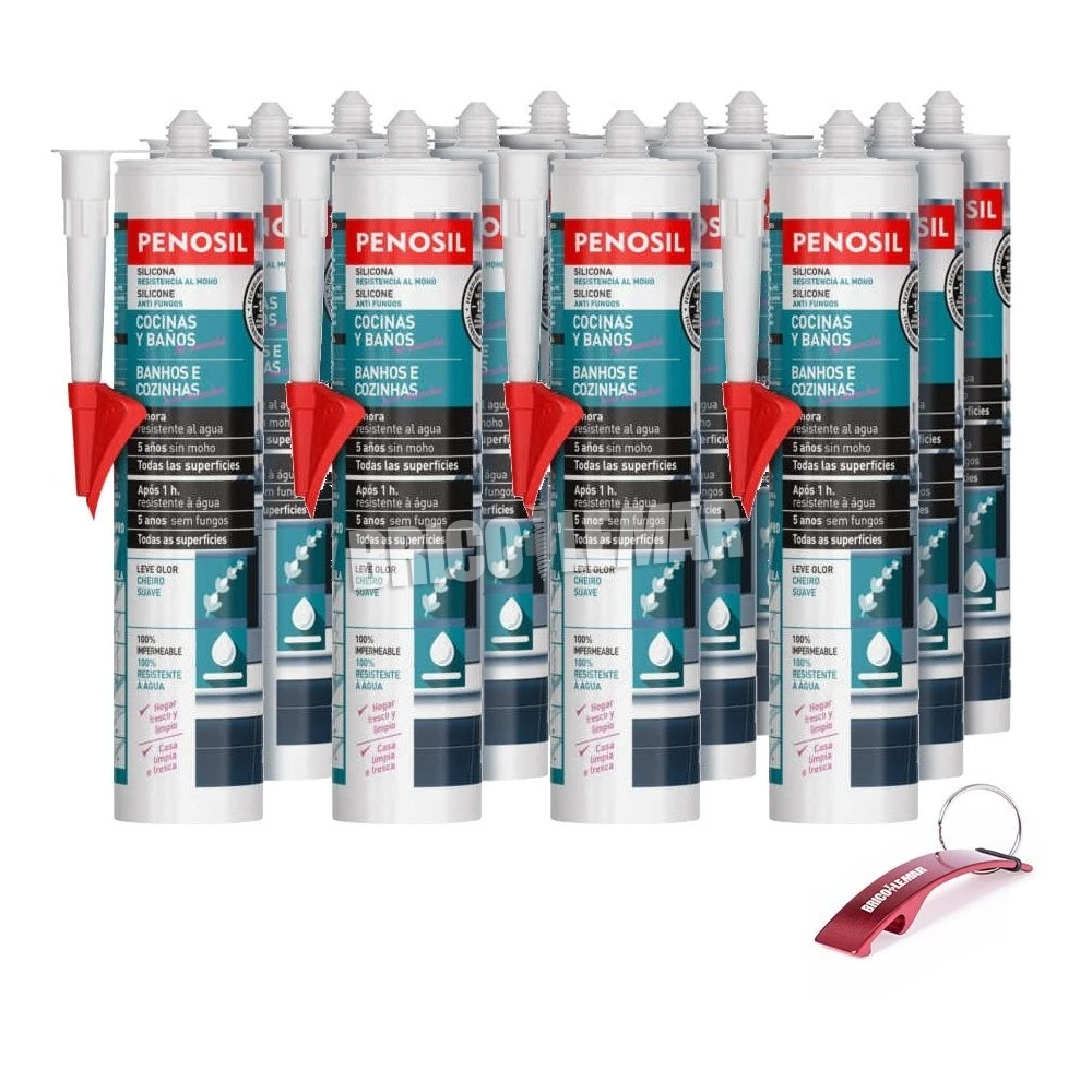 Caja con 12 cartuchos de Penosil Cocinas y Baños No mancha, un nuevo sellante de silicona de altas prestaciones y rápido curado que se activa con la humedad de la duchas ofreciendo un acabado flexible y extremadamente resistente al agua. La silicona Cocinas y Baños No mancha puede exponerse al agua en tan solo 1 hora manteniendo su durabilidad, adhesión y elasticidad durante años.