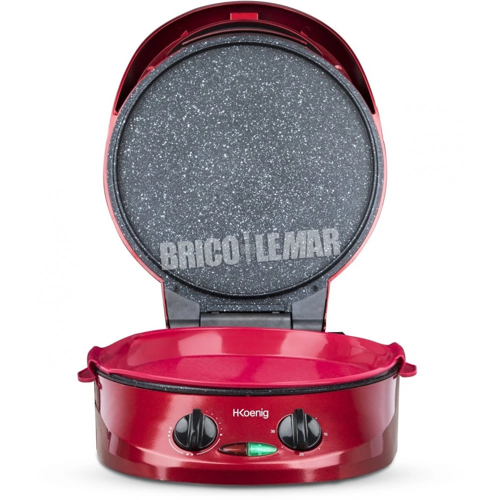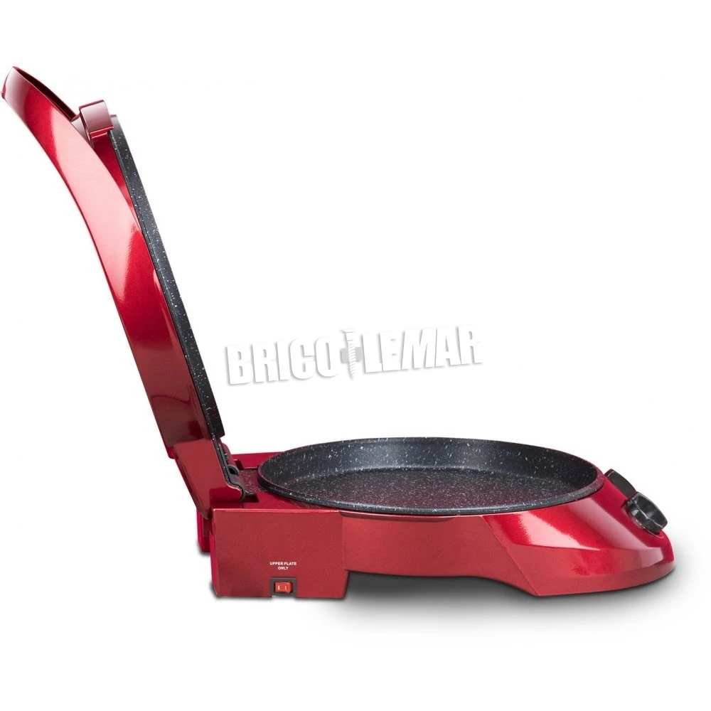 Con sus 2 placas que calientan, se puede preparar deliciosas pizzas, tartas, quiches etc. 3 veces más rápido que cuando utiliza un horno regular. Con apertura de 180º, controlador de temperatura y controlador de tiempo de cocción para una cocción perfecta. Apagador de la placa superior.