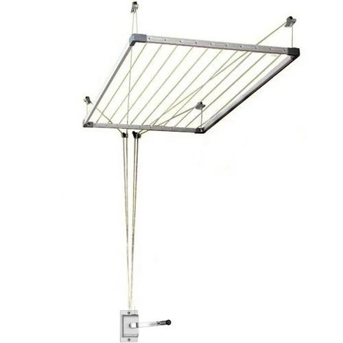 Tendedero de aluminio para el techo ajustable a lo ancho entre 100 y 160 cm, y regulable en altura gracias a su mecanismo de poleas accionado por una manivela colocada en la pared. Con este tendedero podremos ahorrar espacio y tender de una forma cómoda, ya que para colgar la ropa bastará con bajarlo a la altura deseada y, una vez colgada toda la colada, podremos subir el tendedero hacia el techo para que no moleste mientras se seca la ropa. Soporta fácilmente hasta 12 kg de ropa en una longitud de tendido total entre 16 y 19 metros.